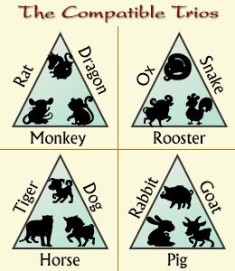 | მამალი | ხარი, გველი | ვირთხა, მამალი, ძაღლი, კურდღელი | ვეფხვი, ცხენი, მაიმუნი, ცხვარი, ტახი |